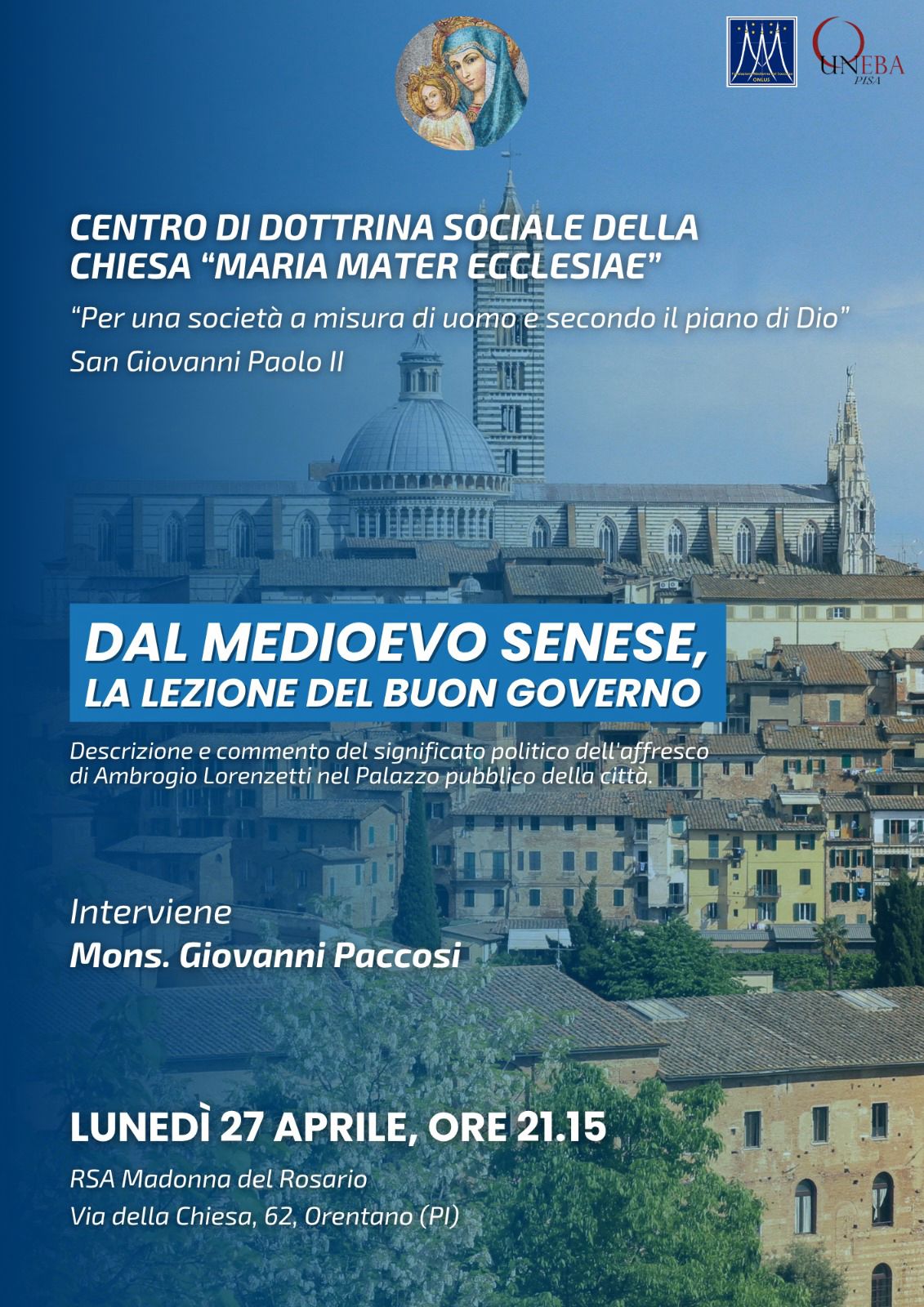 Dal Medioevo senese una lezione di civiltà. Lunedì 27 Aprile, alle ore 21.15, presso la Rsa "Madonna del Rosario" di Orentano, sarà il Vescovo di San Miniato monsignor Giovanni Paccosi ad esporre questa proposta di riflessione. A partire dall'allegoria del "Buon governo" del XIV secolo, dipinta da Ambrogio Lorenzetti (Siena, 1290 - Siena, 1348) e conservata a Palazzo Civico di Siena, sarà delineato il quadro di quella che viene definita - anche dal nome - l'esperienza di una buona amministrazione di governo.