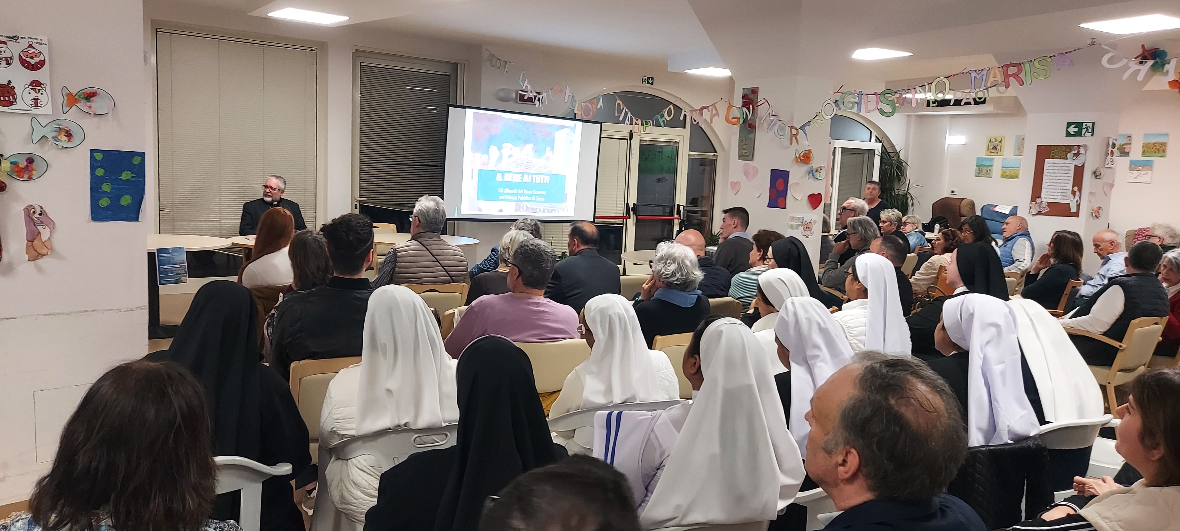 Si è tenuta il 27 Aprile alle ore 21. 15 presso la Rsa Madonna del Rosario di Orentano (Pi) la Conferenza 'Dal medioevo senese, la lezione del buongoverno' tenuta da S. E. Rev.ma Mons. Giovanni Paccosi ed organizzata congiuntamente dal Centro di dottrina sociale 'Mater Ecclesiae', da Uneba Pisa e Fondazione 'Madonna del soccorso'. La serata è iniziata con il canto congiunto del Regina caeli. E' seguita l'introduzione al tema da parte dell'avv. Riccardo Novi Presidente Uneba Pisa e della dott.sa Maria Teresa Parrino Presidente del Centro di dottrina sociale. A seguire mons. Vescovo ha avviato l'interessante riflessione che - con estrema chiarezza - ha illustrato il significato profondo del ciclo pittorico senese e del suo riflesso sui temi connessi al 'buon governo' anche con riferimenti all'attuale contesto socio-politico internazionale.