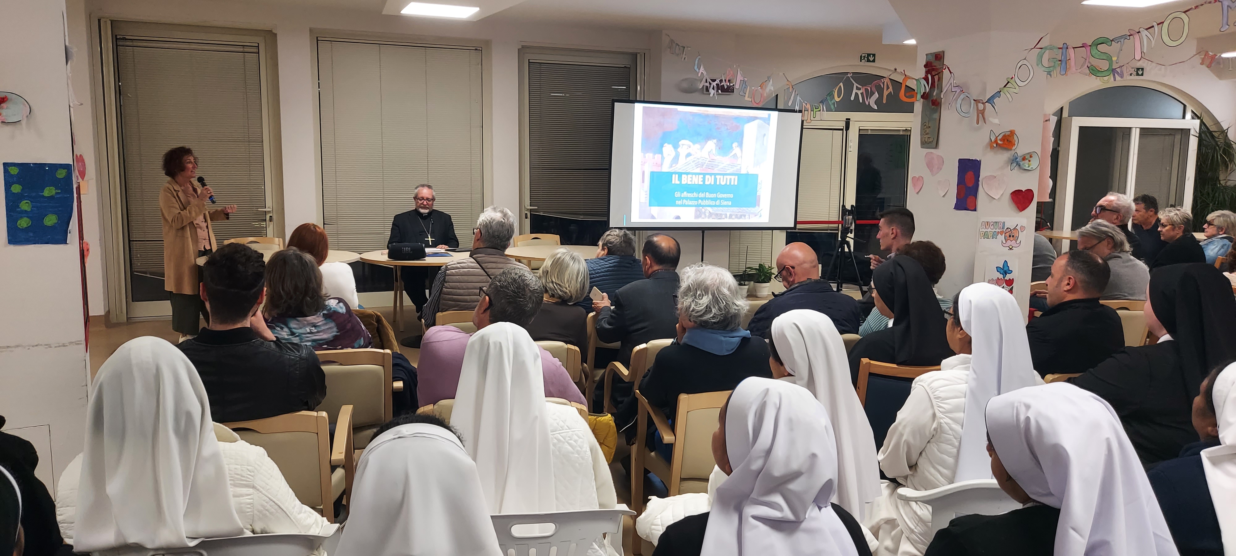 Si è tenuta il 27 Aprile alle ore 21. 15 presso la Rsa Madonna del Rosario di Orentano (Pi) la Conferenza 'Dal medioevo senese, la lezione del buongoverno' tenuta da S. E. Rev.ma Mons. Giovanni Paccosi ed organizzata congiuntamente dal Centro di dottrina sociale 'Mater Ecclesiae', da Uneba Pisa e Fondazione 'Madonna del soccorso'. La serata è iniziata con il canto congiunto del Regina caeli. E' seguita l'introduzione al tema da parte dell'avv. Riccardo Novi Presidente Uneba Pisa e della dott.sa Maria Teresa Parrino Presidente del Centro di dottrina sociale. A seguire mons. Vescovo ha avviato l'interessante riflessione che - con estrema chiarezza - ha illustrato il significato profondo del ciclo pittorico senese e del suo riflesso sui temi connessi al 'buon governo' anche con riferimenti all'attuale contesto socio-politico internazionale.